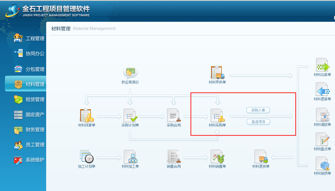 第一步,進入工程項目管理系統(tǒng)的【材料管理】模塊,點擊[采購合同],如圖: