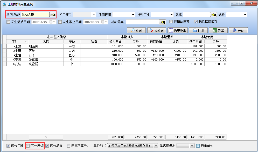 【工地材料用量查詢】是在工地現場材料管理中查詢工地材料用量,在查詢前需要設置查詢項目設置查詢項目為金石大廈,查詢結果如下圖: