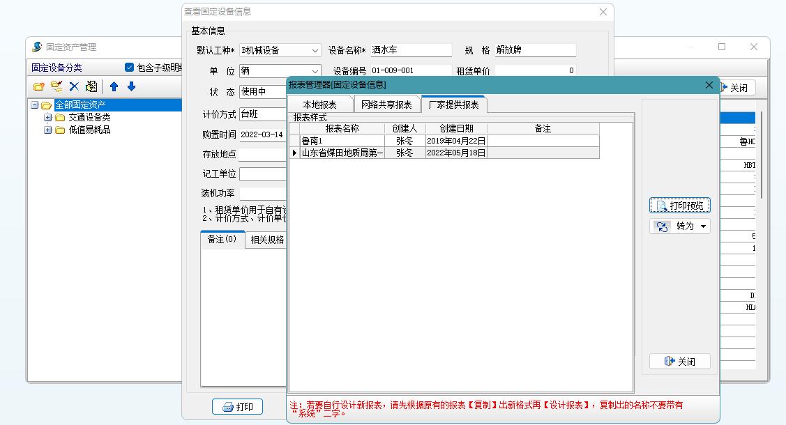 具體操作:在設(shè)備維護中選擇設(shè)備點擊打印,根據(jù)設(shè)計的報表樣式生成打印預(yù)覽