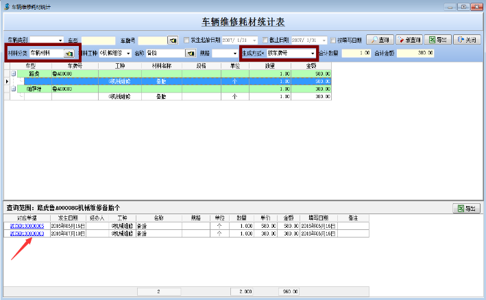 【材料管理】→【其它出庫單】,出庫類別→車輛維修→車牌號