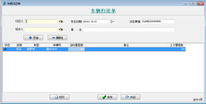 注:三個單據中“上次里程數”,系統自動檢索之前最近的一個單據的“當時里程數”,如果沒有最近的單據則為【內部車輛維護】中所填寫的“期初里程數”。
