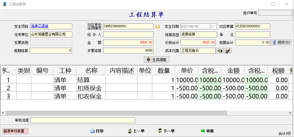【工程結算單】增加成本歸集功能,可通過成本計劃單設置暫估收入,工程結算單產生結算收入,成本利潤表查詢自定義成本、利潤 。