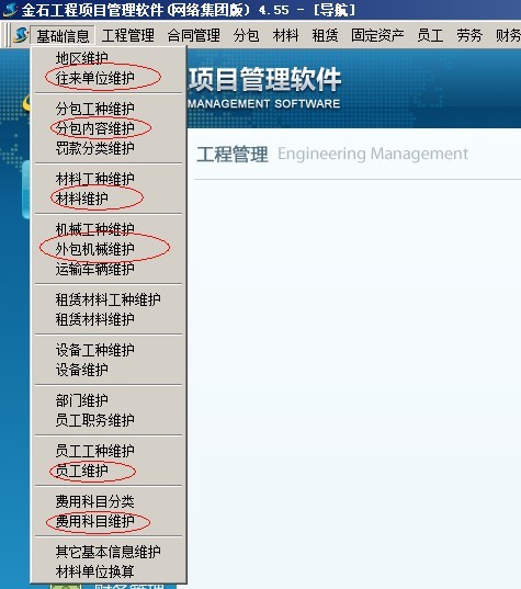 在軟件開始使用之前,必須建立好員工信息、材料信息、往來單位信息、分包內(nèi)容信息、費(fèi)用科目信息等基礎(chǔ)信息。在試用版軟件中,已經(jīng)默認(rèn)添加了一部分基礎(chǔ)信息,您可以在此基礎(chǔ)上根據(jù)公司實(shí)際情況做調(diào)整。建立好后,以后只需調(diào)用就不需重新輸入了。基礎(chǔ)信息可在軟件左上角基礎(chǔ)信息菜單中或各模塊右側(cè)相關(guān)基礎(chǔ)信息中維護(hù)。如下圖:
