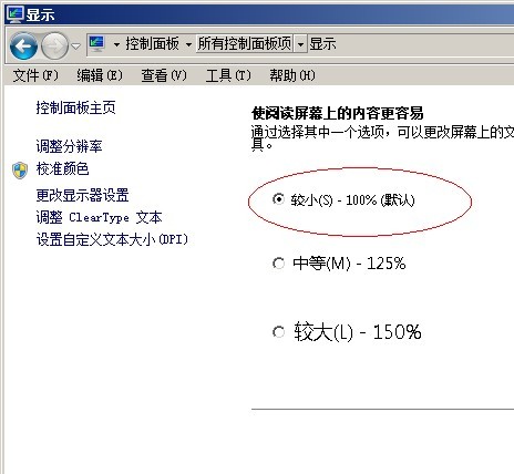 3. 在彈出的顯示窗口中選擇【較小S 100%(默認)】根據(jù)提示重啟系統(tǒng)后,界面就會顯示正常。